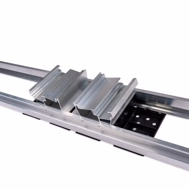 Verbinder-Set Ost-West für Flachdachsystem III mit integrierten Basisfüßen als vorderes Modulauflager in der Anlagenmitte